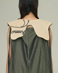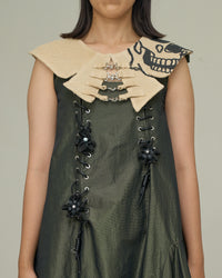 肋骨を模した金具使いと、肩にかかるように広がる構築的なシルエットが特徴の付け襟。
