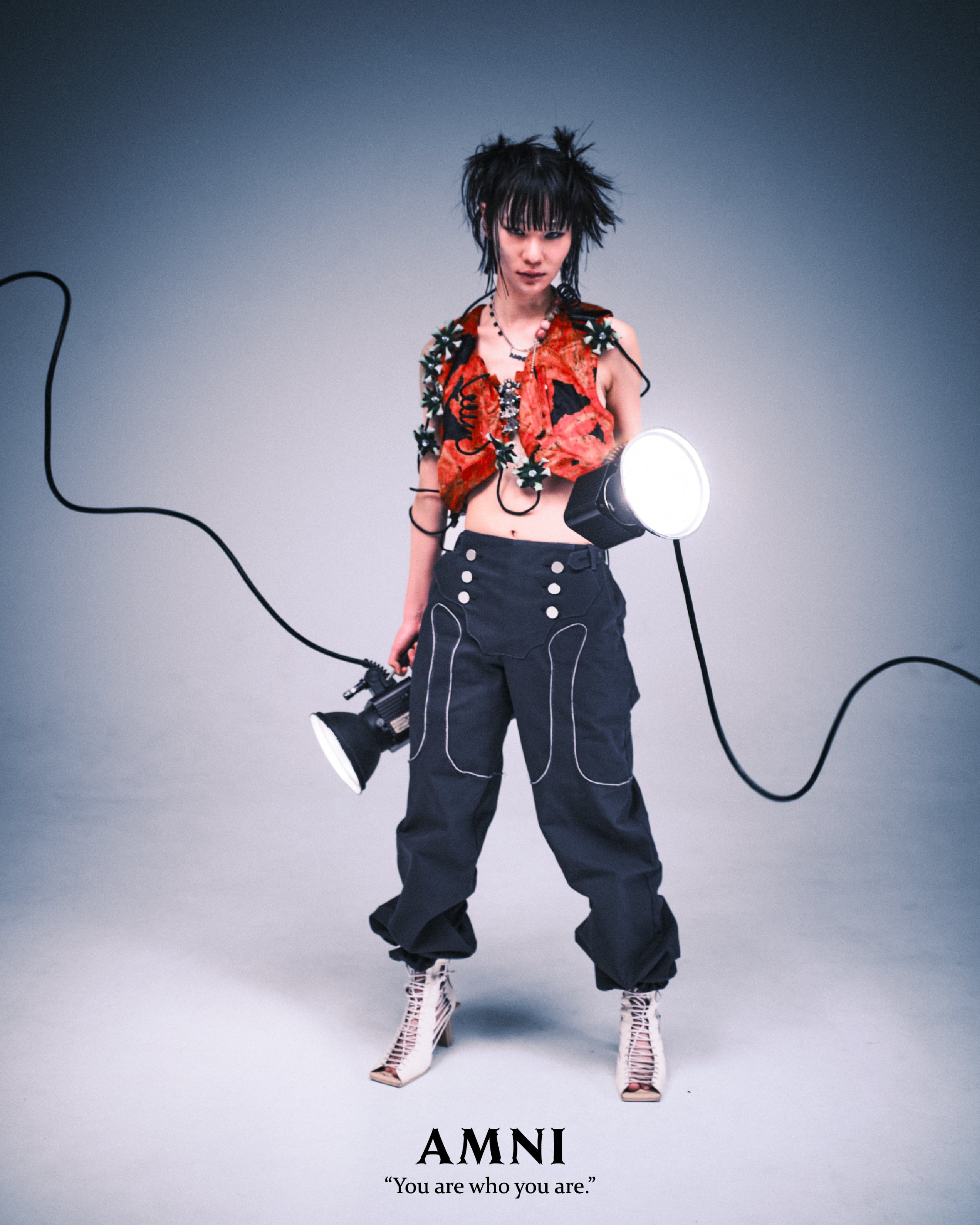 Tout en intégrant la fonctionnalité du techwear, il combine des détails durs et atypiques tels que des crampons et des agrafes de soutien-gorge, mêlant physicalité et expérimentation.