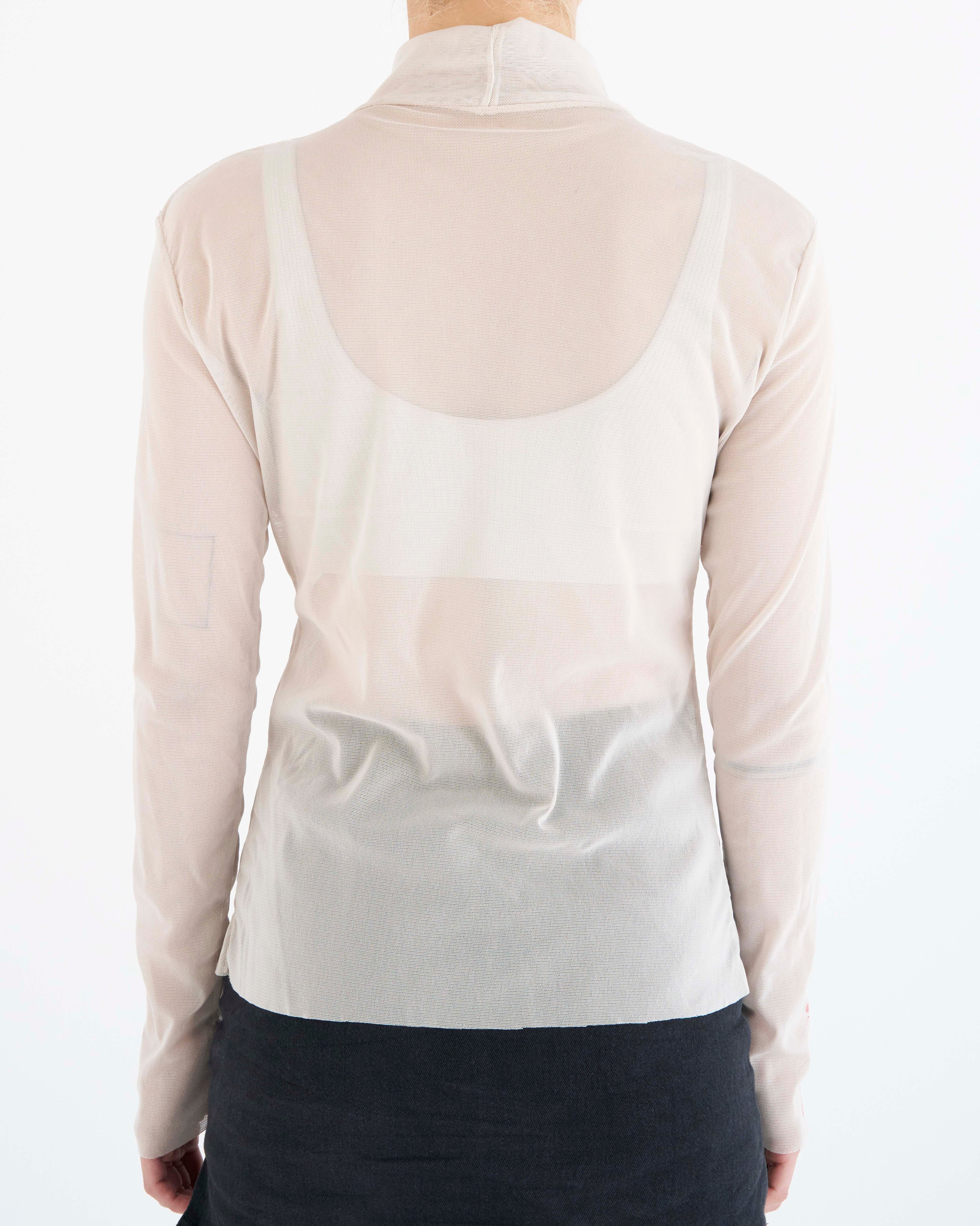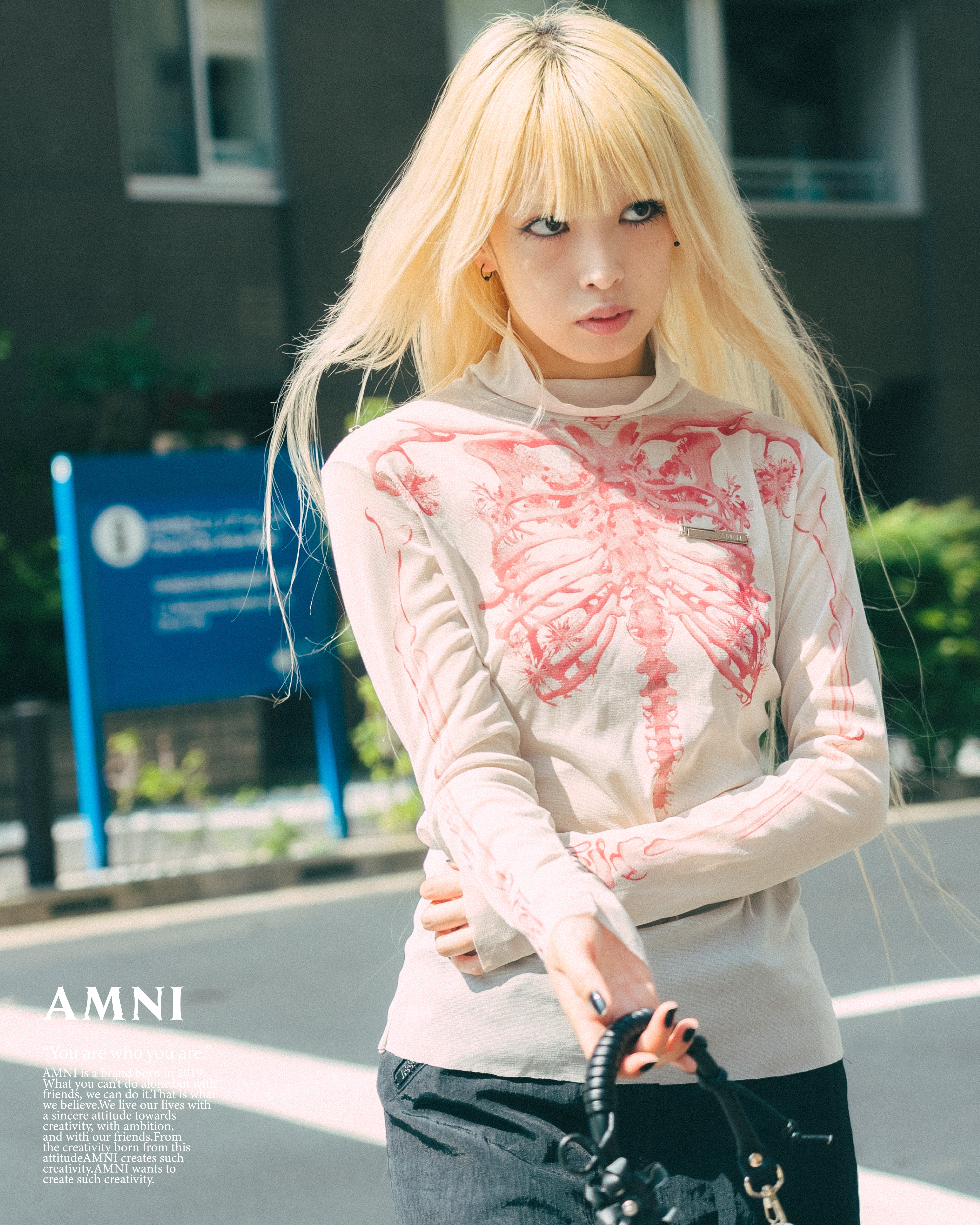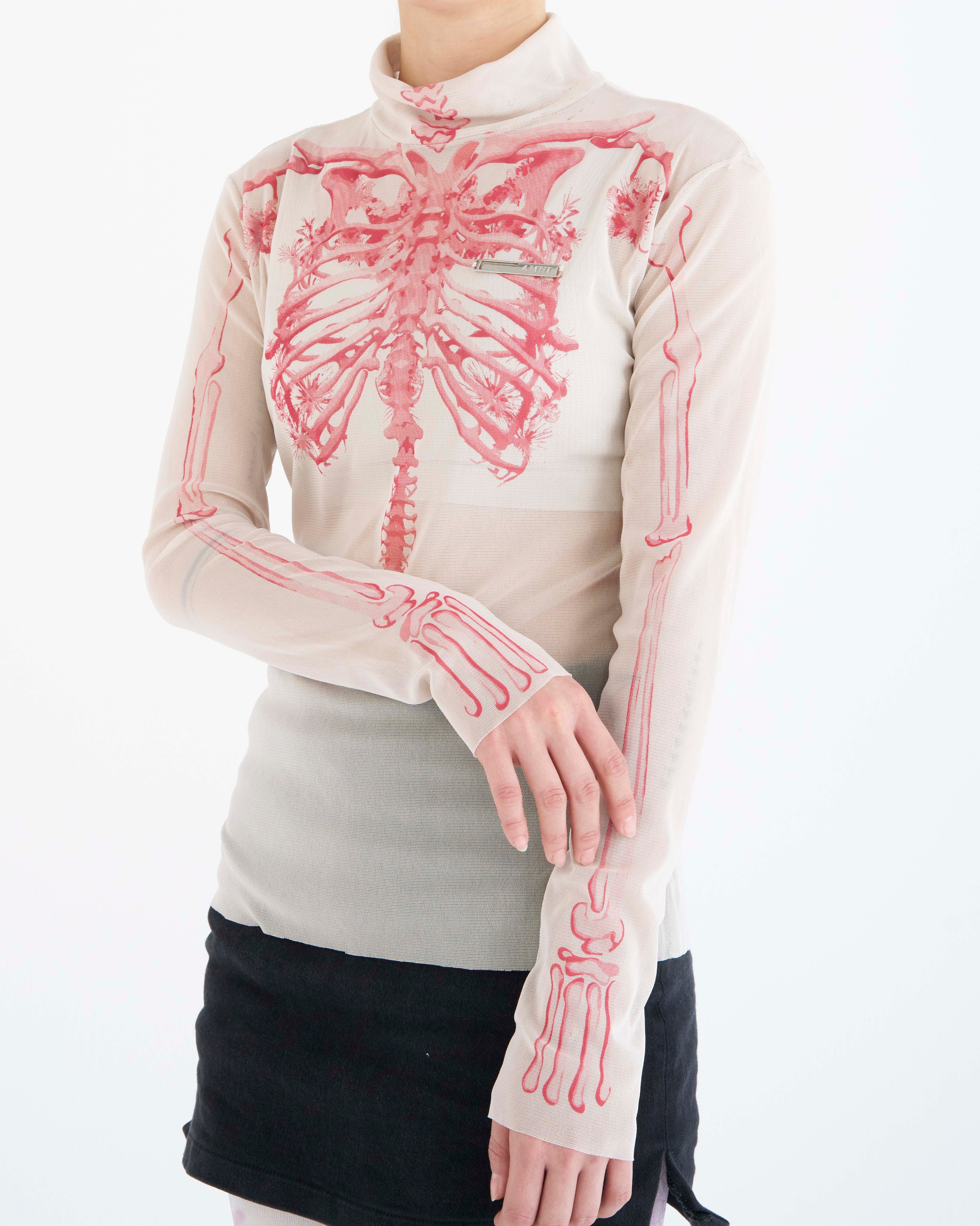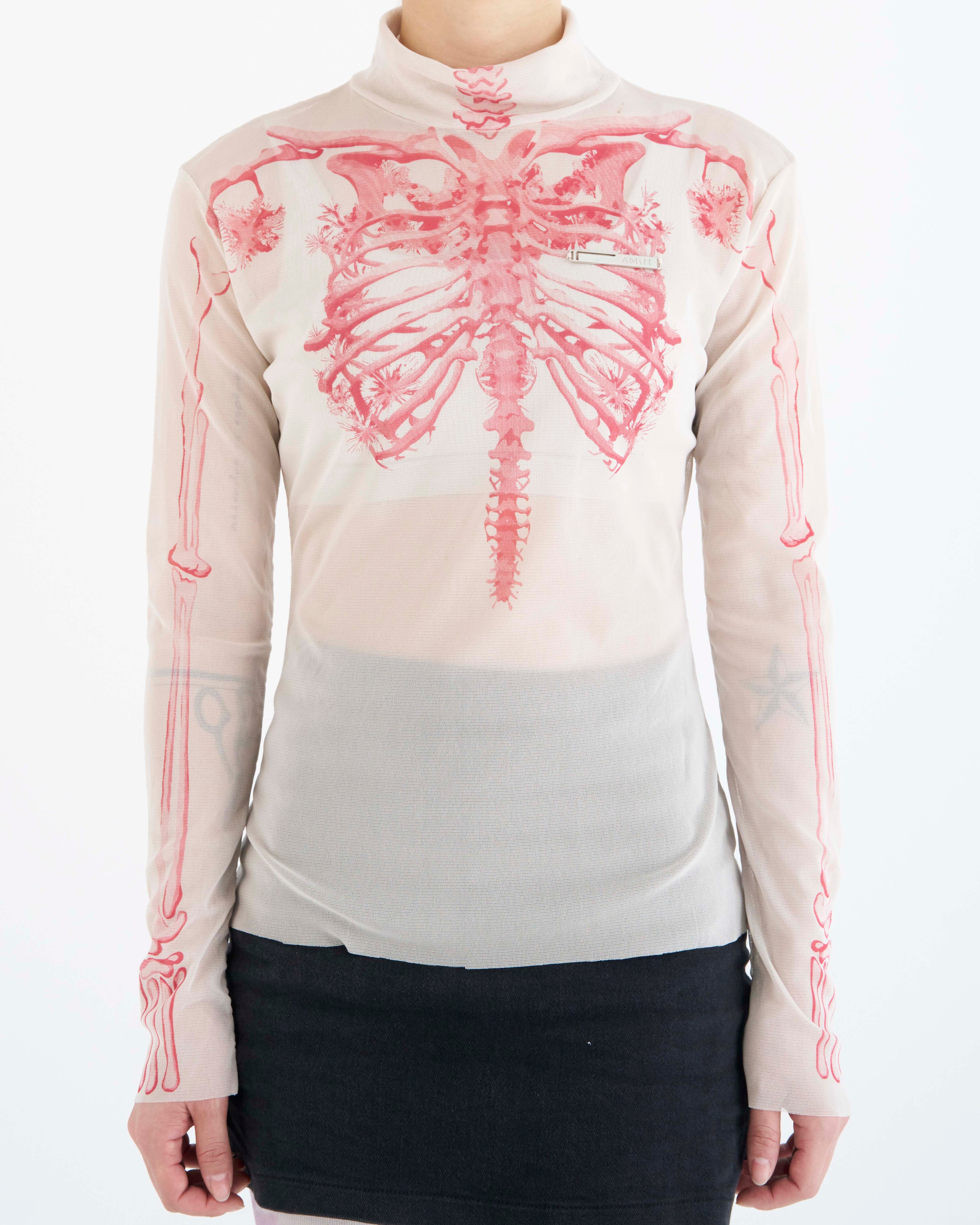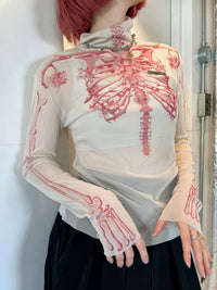 Un haut à manches longues avec un graphisme audacieux donnant l'impression que la structure osseuse est visible, superposé sur un tissu transparent.