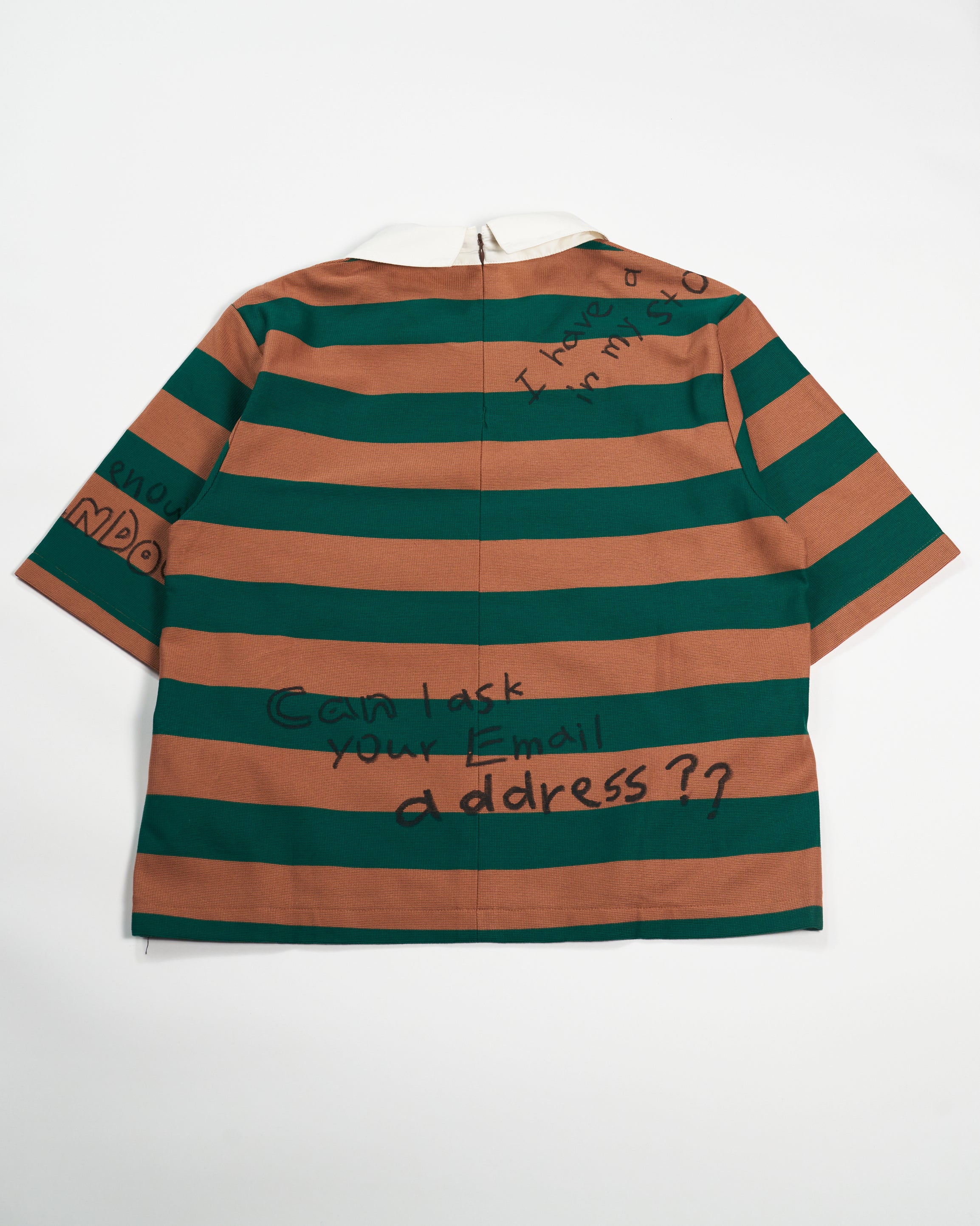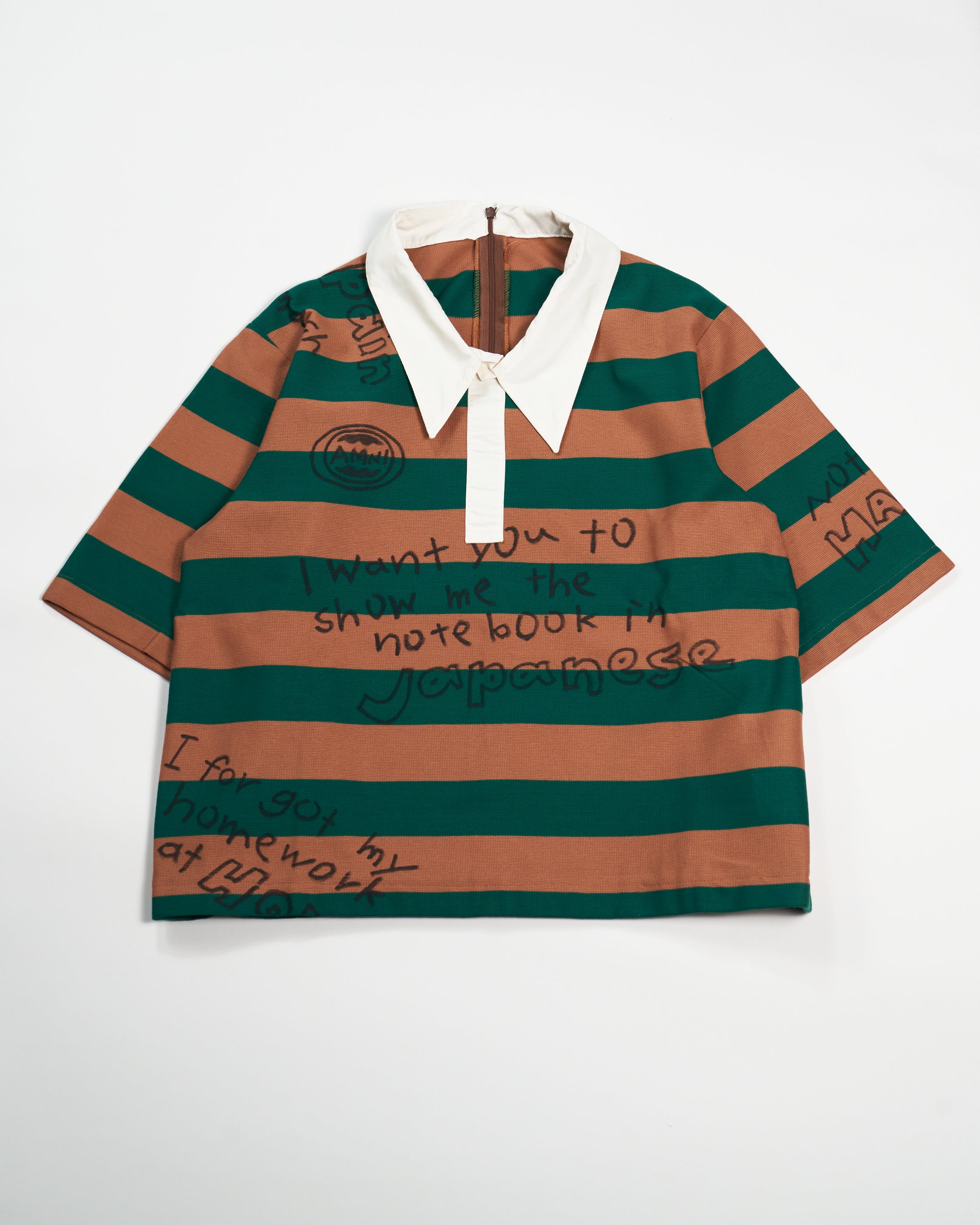 Un polo orné d'un graphisme griffonné, inspiré des mots entendus à l'école primaire.