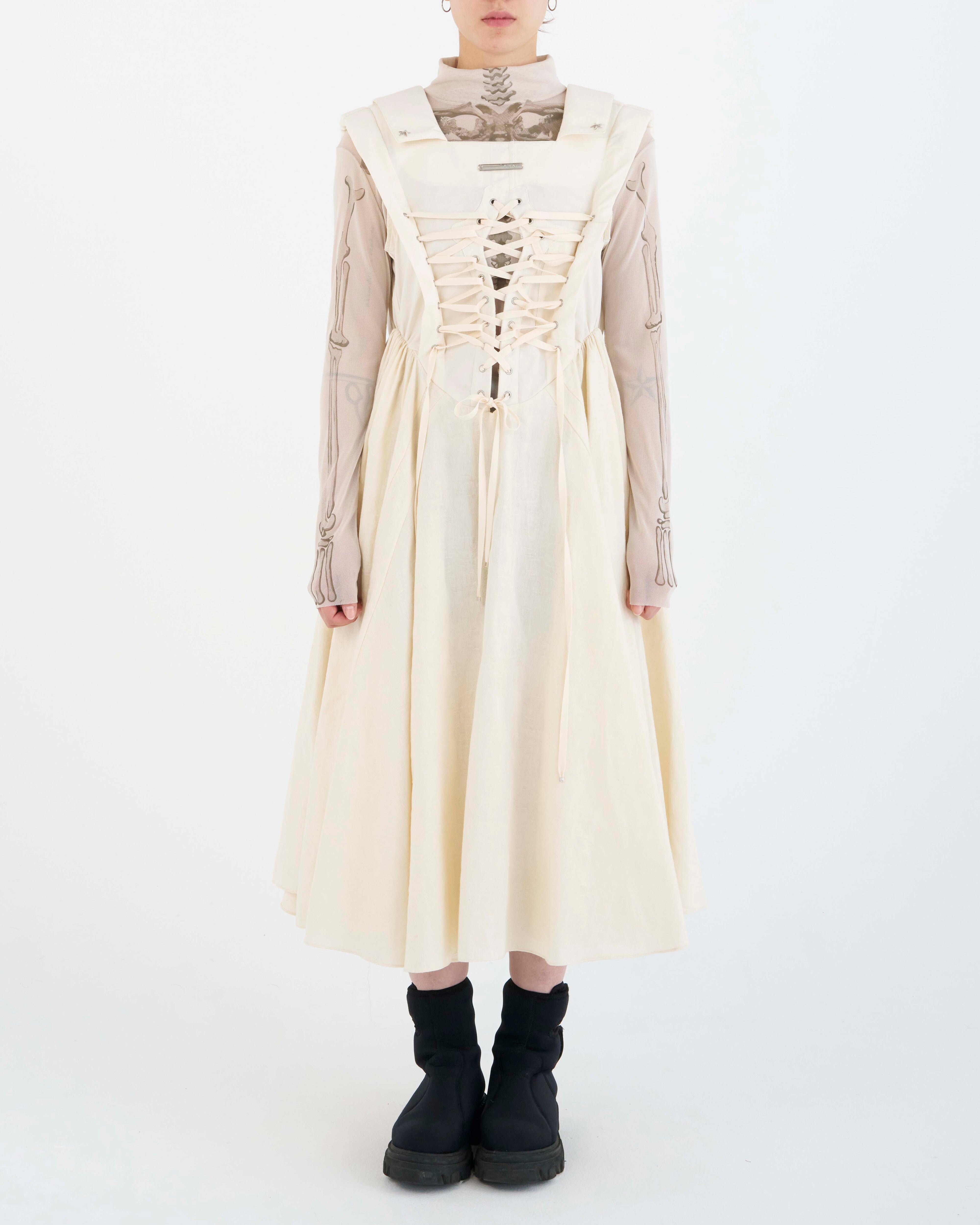 앞면의 레이스업은 갈비뼈와 척추를 따라 짜여져 신체 구조를 반영하는 듯한 형태를 이루고 있습니다.