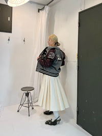 어깨 패드를 넣은 강인한 숄더 라인과 밑단으로 갈수록 퍼지는 스커트가 실루엣을 돋보이게 하여 스타일 업을 완성하는 한 벌입니다.
