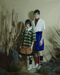 센터 턱과 소재감의 갭이 장난기를 만들어내며, 고무 허리밴드 사양으로 프리 사이즈의 쾌적한 착용감을 실현했습니다.