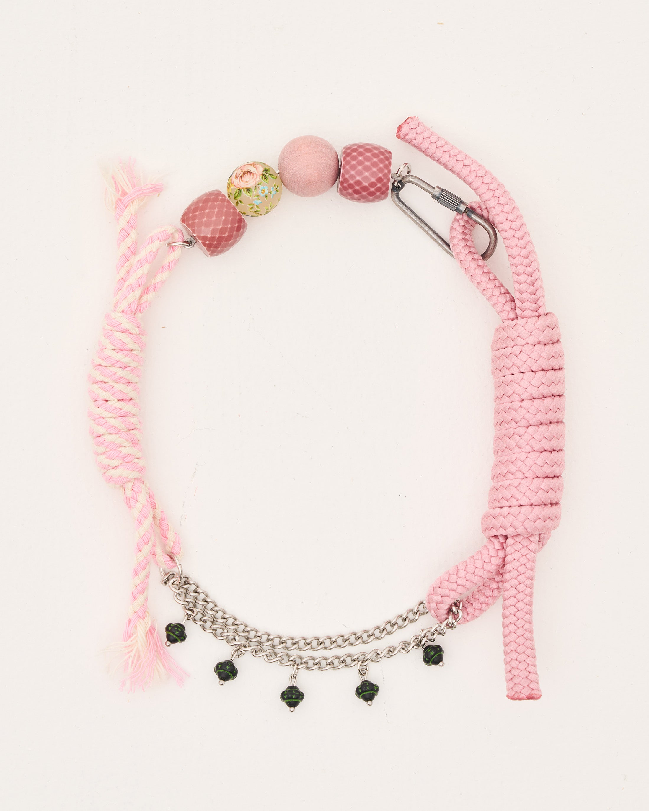 부드러운 핑크 로프에 플로럴 모티브의 비즈와 체인을 조합한 단 하나뿐인 목걸이입니다.