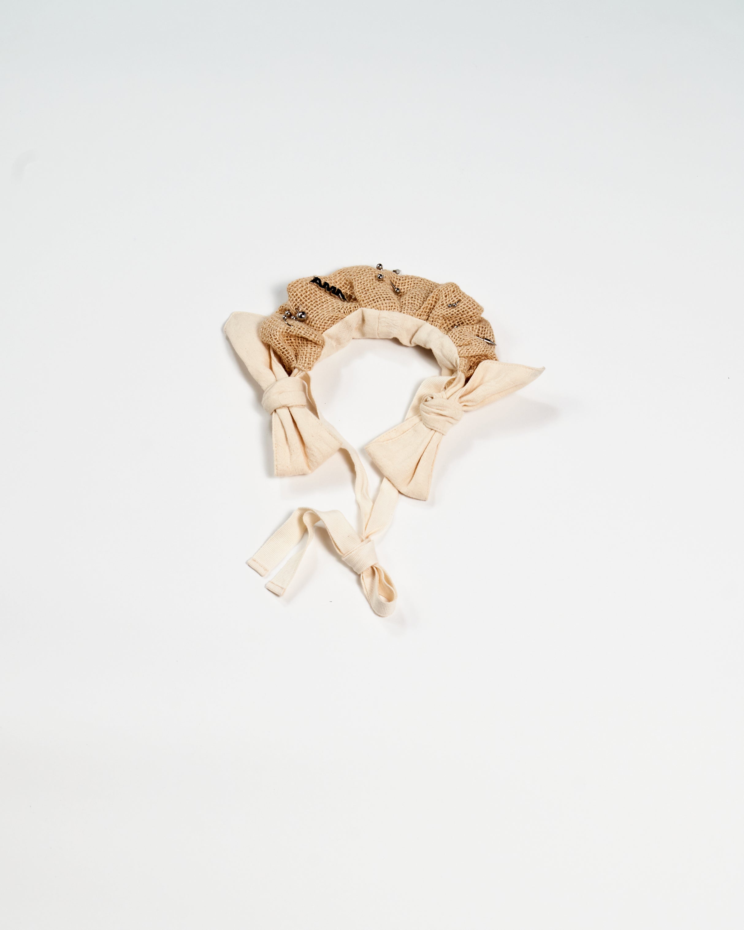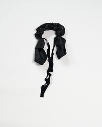 리본은 목 뒤나 턱 아래에서 묶을 수 있으며, 양쪽 '귀'는 묶는 방법에 따라 우아하거나 드라마틱하게 실루엣을 변화시킵니다.
