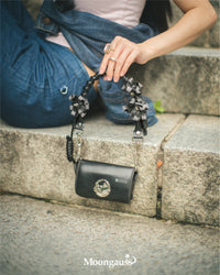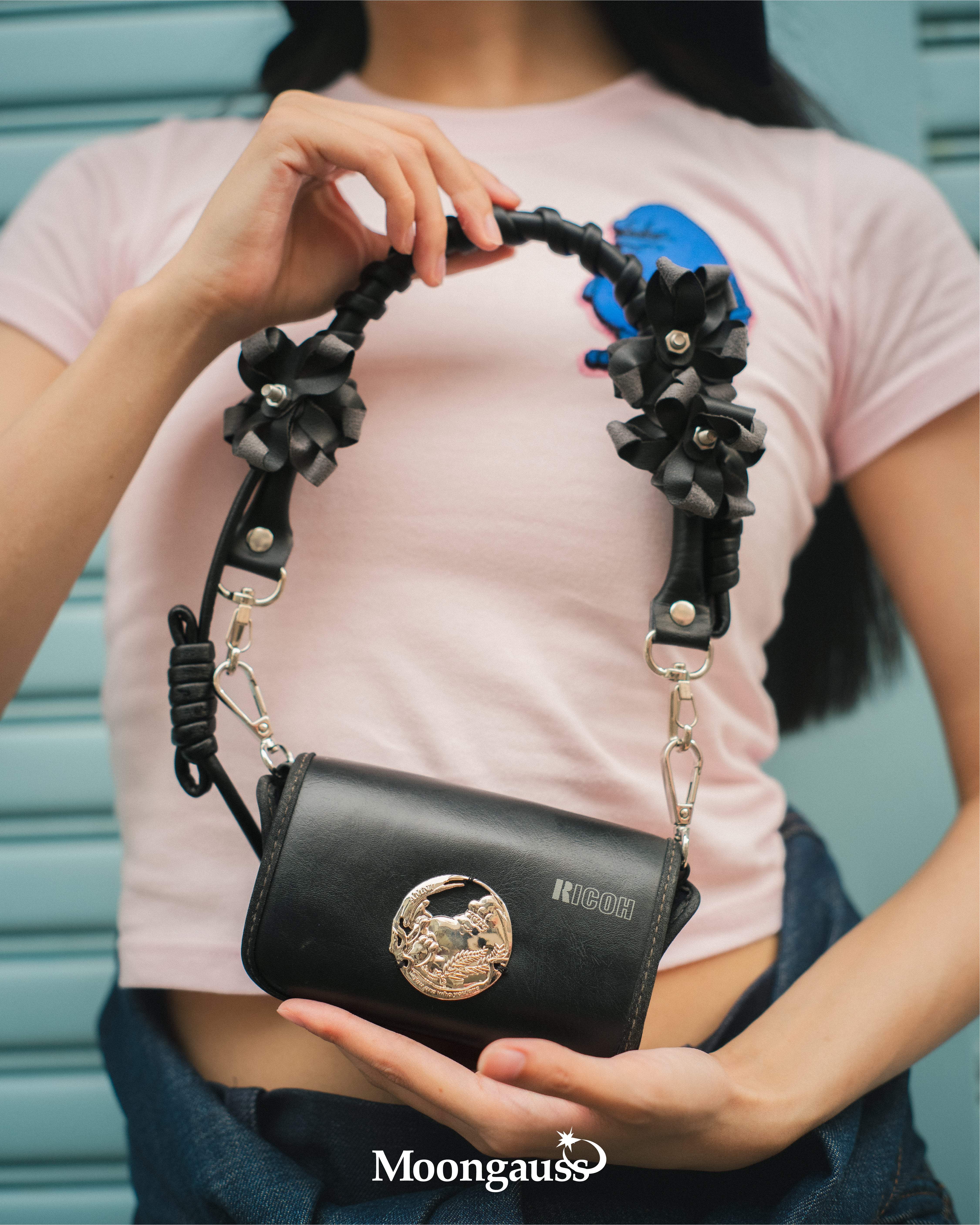카메라 가방 특유의 독특한 형태에, 손수 만든 꽃 모티프를 대담하게 감쌌습니다.