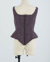 フロントの深みあるパープル千鳥格子とブラックの構築的なデザイン。